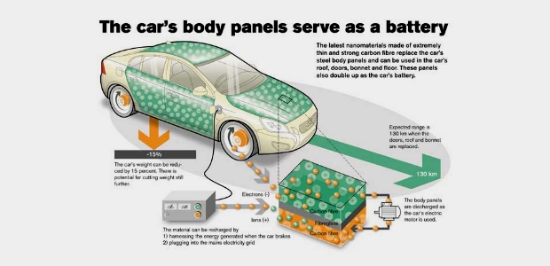Volvo has developed a new concept for storing electrical power using car body panels instead of a traditional battery. It may be a few years away from production, but it’s a very smart concept. Volvo is working together with independent research groups to develop a means of energy storage for future electric cars that does away completely with traditional battery and super capacitor systems, which typically carry considerable weight and take up a lot of space. The solution is a new type of material that integrates nano-structured batteries and super capacitors together with carbon fibre, which can be formed into body panels for a car. Read more
